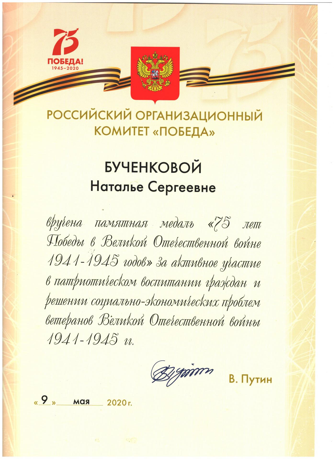 Директору Муромского КЦСОН вручена памятная медаль "75 лет Победы в Великой Отечественной войне 1941-1945 годов" за активное участие в патриотическом воспитании граждан и решении социально-экономических проблем ветеранов Великой Отечественной войны 1941-1945 г.г."