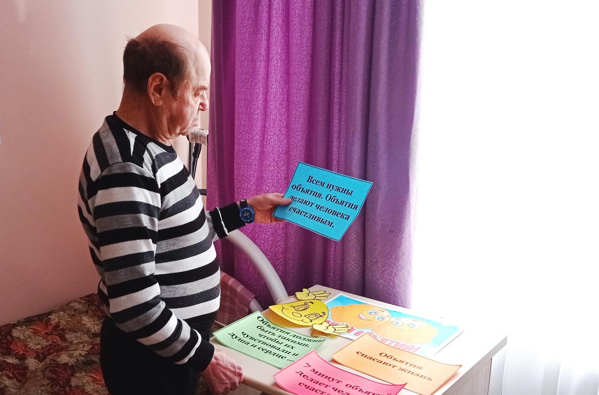 Сегодня в ОМ «Резиденция цветов» прошла акция «День обнимашек», приуроченная к Международному дню объятий. На мероприятии получатели социальных услуг познакомились с обычаями праздника и интересными фактами о важности объятий. В этот день проживающие отделения с удовольствием говорили добрые, приятные слова, и, конечно же, при помощи забавных смайликов дарили друг другу объятия и улыбки.