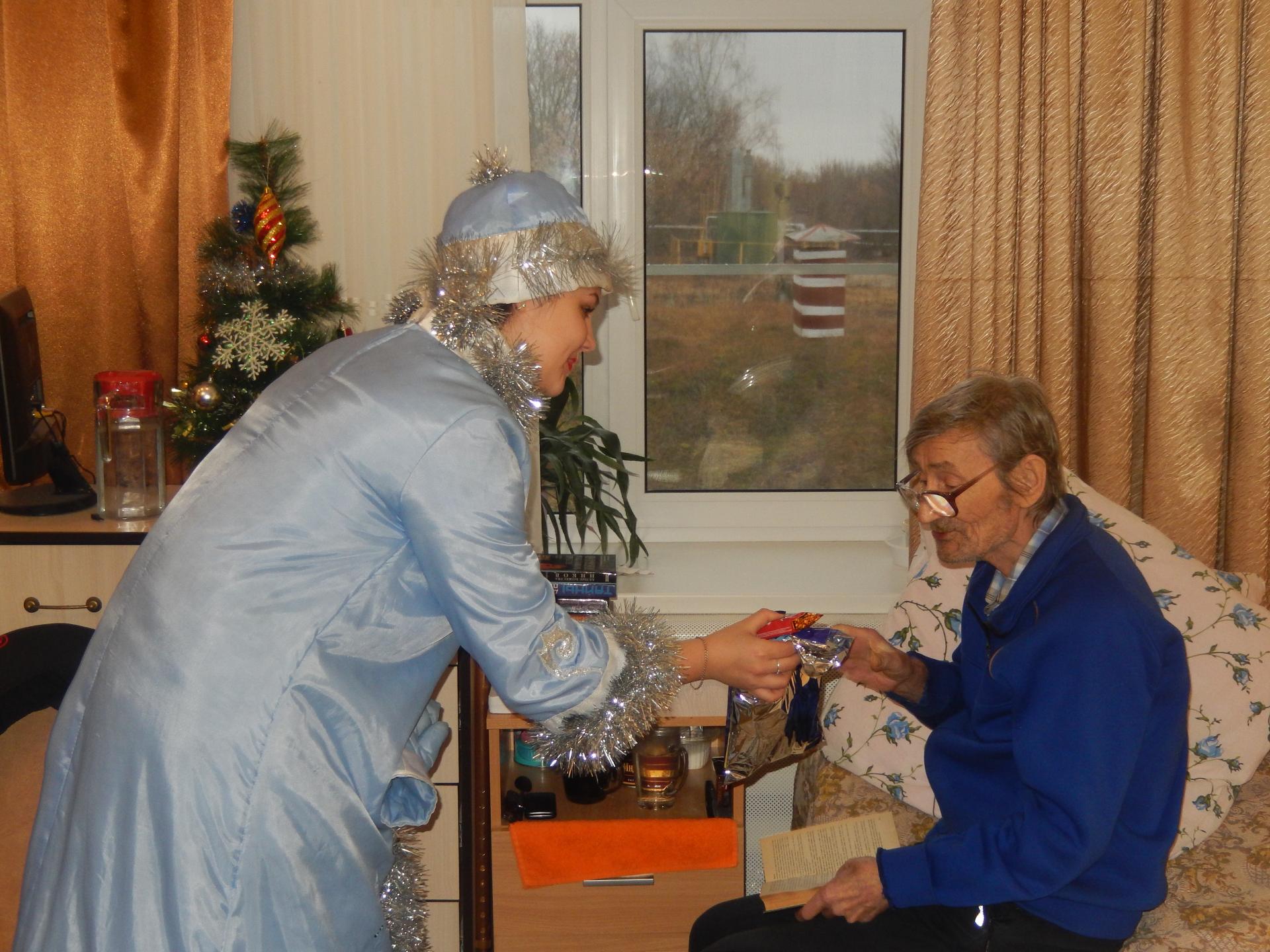 На этом новогодние радости не закончились, для тех, кто по состоянию здоровья не смог посетить новогоднее представление организованы отдельные поздравления и вручение подарков от Деда Мороза и Снегурочки.