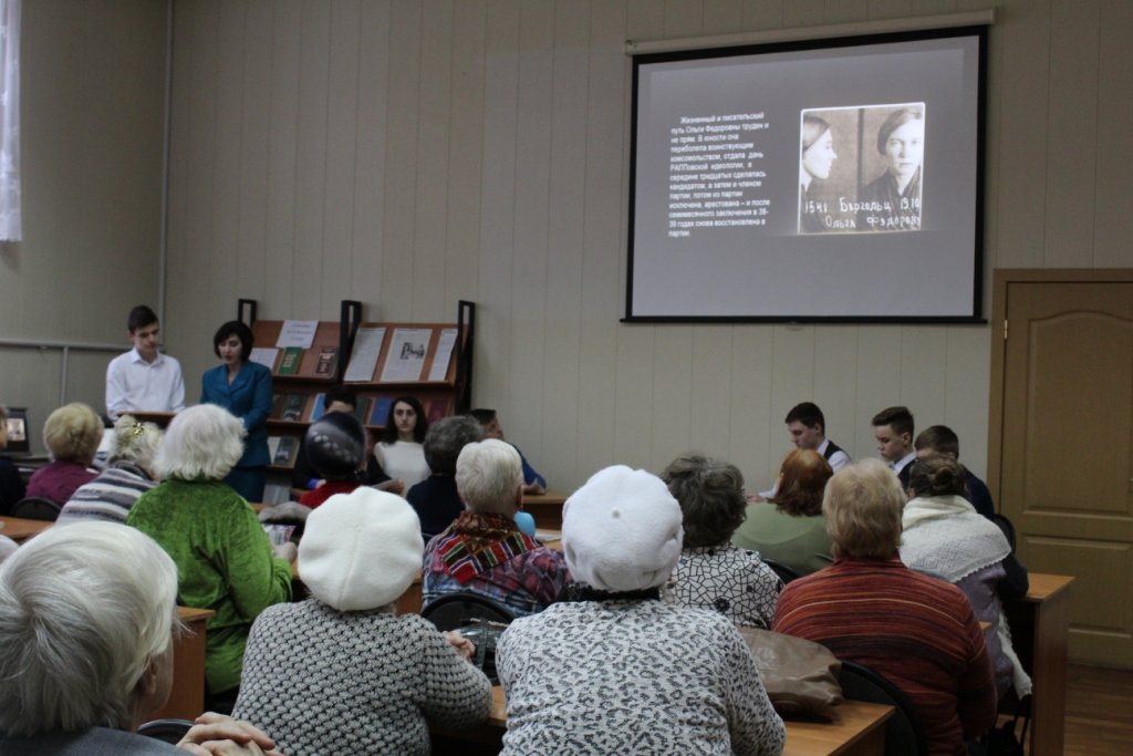 21.02.2019 г. в аудитории ГБПОУ ВО "Муромский колледж радиоэлектронного приборостроения" состоялась лекция факультета «История литературы» на тему «Творчество О.Берггольц». Преподаватель колледжа рассказала об "истоках жизни" Ольги Федоровны, ее духовном и творческом становлении. Взросление девочки, девушки и молодой женщины было показано сквозь призму ранних — отроческих и юношеских — дневников поэтессы. Они позволяют по-новому взглянуть на появление феномена Ольги Берггольц, — легендарной личности, которая пережила сталинские репрессии и «по праву разделенного страданья» стала символом блокадного Ленинграда.