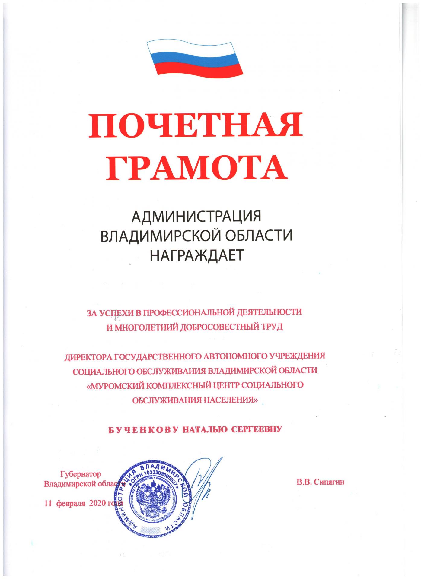 За многолетний, добросовестный труд и успехи в профессиональной деятельности директор Муромского КЦСОН Бученкова Наталья Сергеевна награждена почетной грамотой администрации Владимирской области