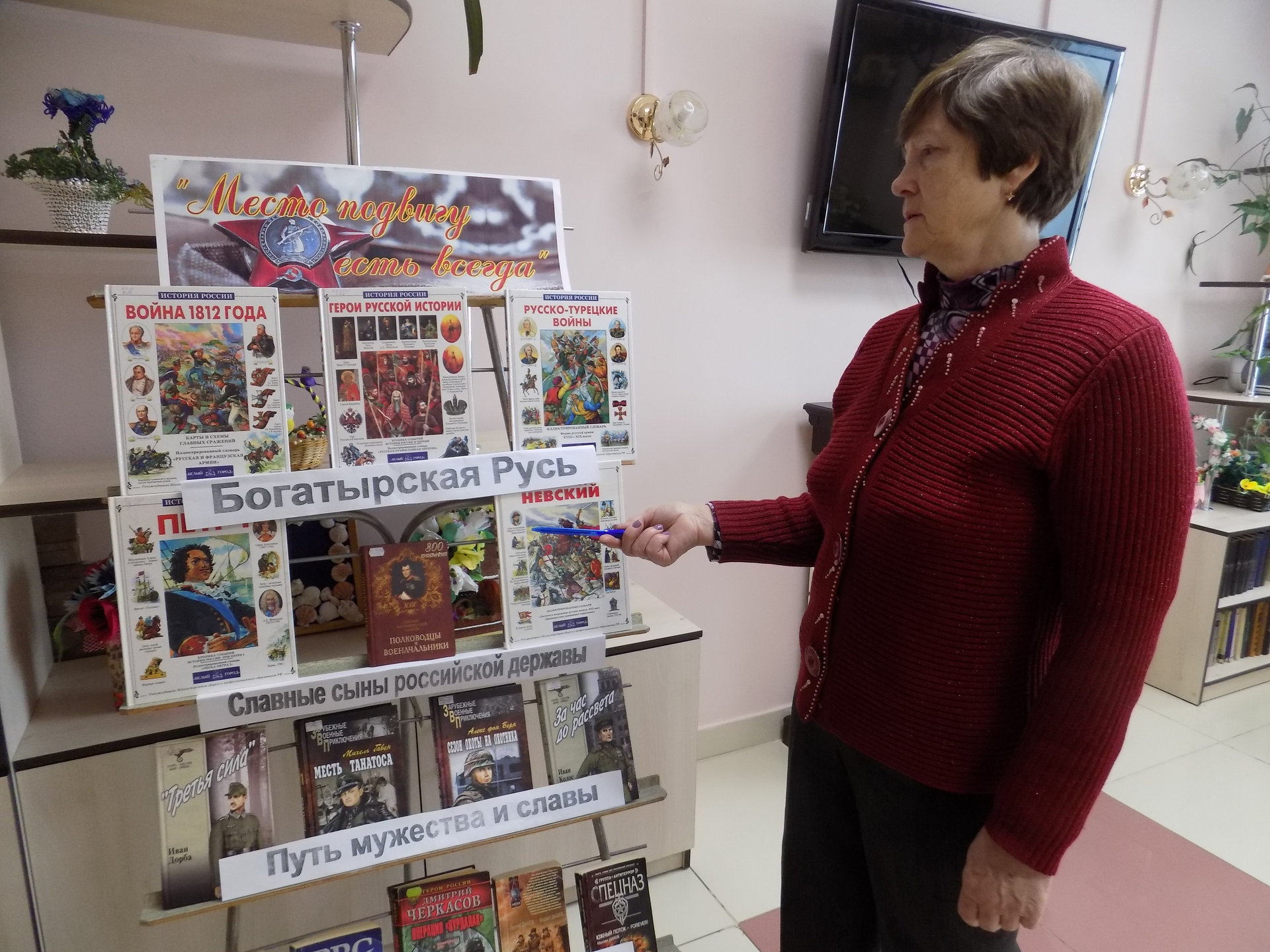 В канун Дня защитника Отечества проживающие в ОМ «Резиденция цветов» познакомились с книгами, представленными на выставке «Место подвигу есть всегда». Издания повествуют о славных сынах Отчизны, которые в разное время героически защищали Родину от вражеских вторжений, спасали во времена военного лихолетья, стояли и стоят на страже мира и покоя страны. Получателям социальных услуг, в свое время исполнившим солдатский долг и прошедшим армейскую школу, книги о героизме, мужестве и верном служении Отечеству особенно интересны.